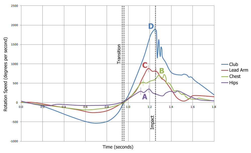 We can see clearly that the swing has relatively smooth accelerations and decelerations until after impact. As we discussed in Golf Swing Sequence and Timing, the swing has a very efficient sequence of motion in the downswing. Each segment reaches speeds that are faster than the previous segment, and then decelerates rapidly as energy is transferred outwards, with each segment peaking fractionally later that the previous one. The hips peak first (A), then the chest (B), then the arms (C), and finally the club (D) at impact.