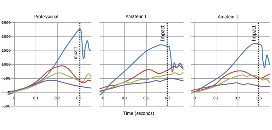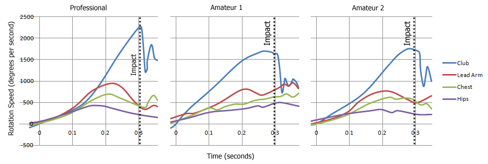 You can clearly see that the club speed of the professional at impact is much higher than that of both amateurs. For whole of the second half of the downswing, until just after impact, the professional’s club is accelerating faster than at any point during either amateur’s downswing.